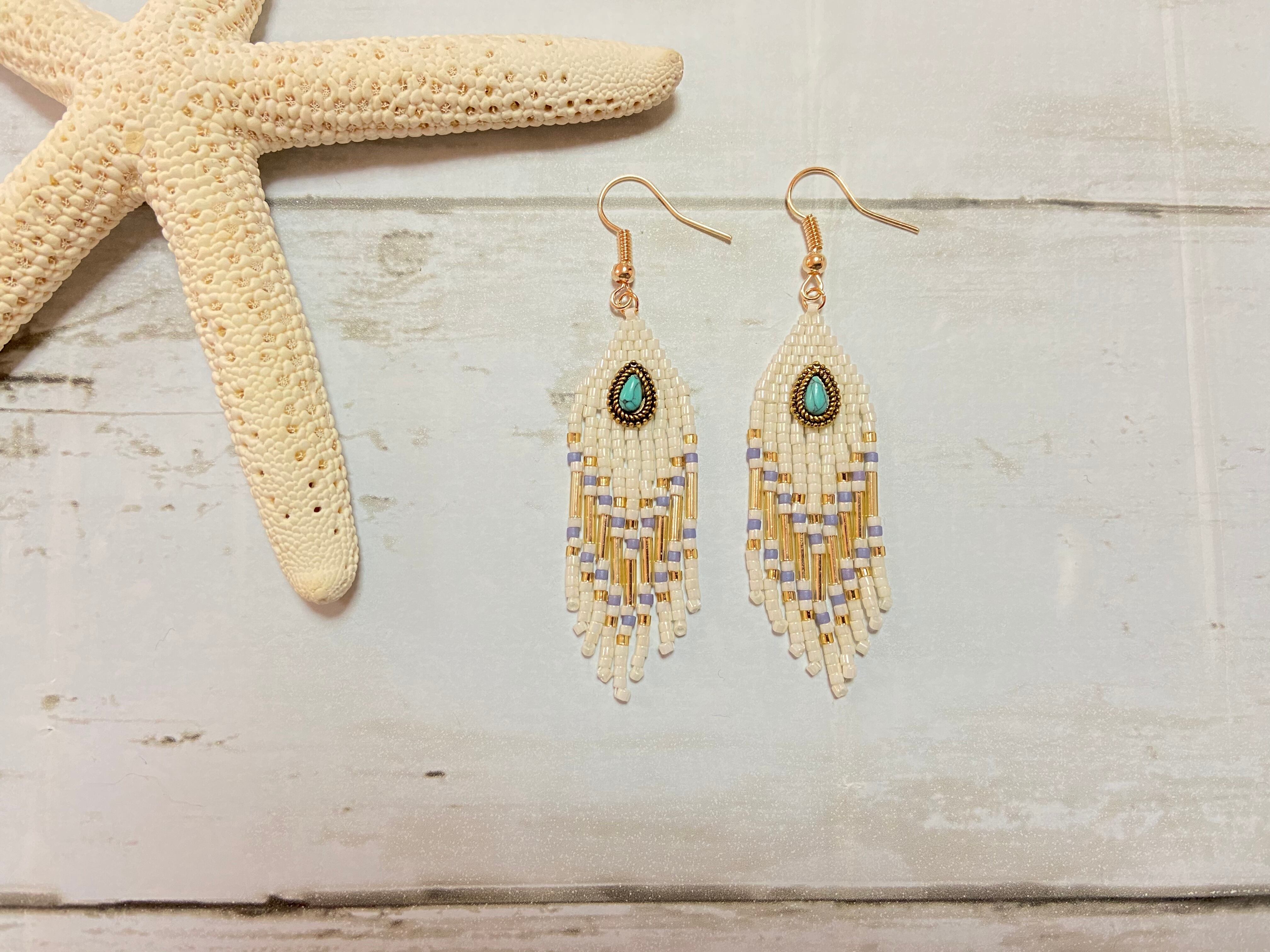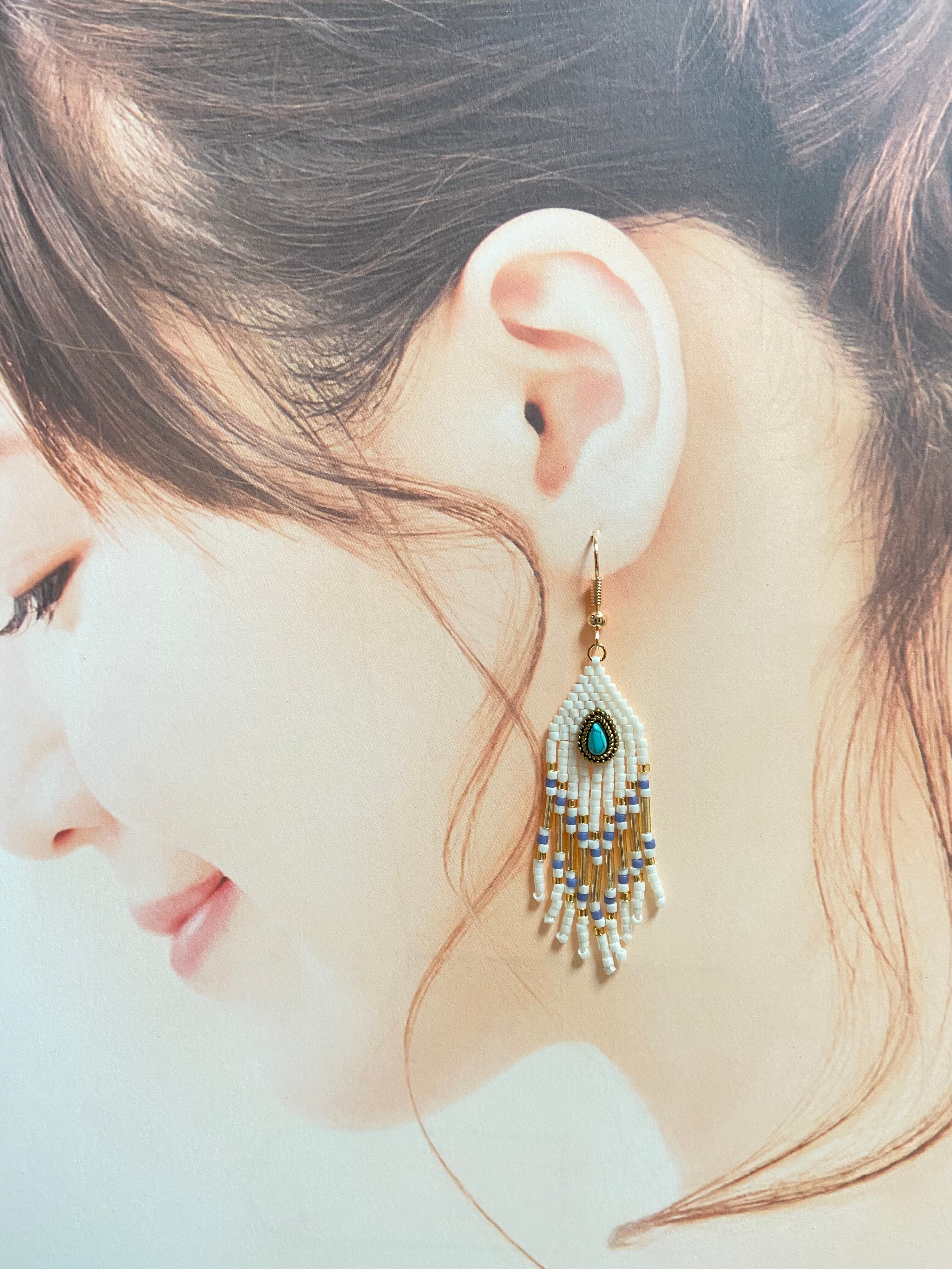 ターコイズフリンジピアス E135 ビーズステッチ