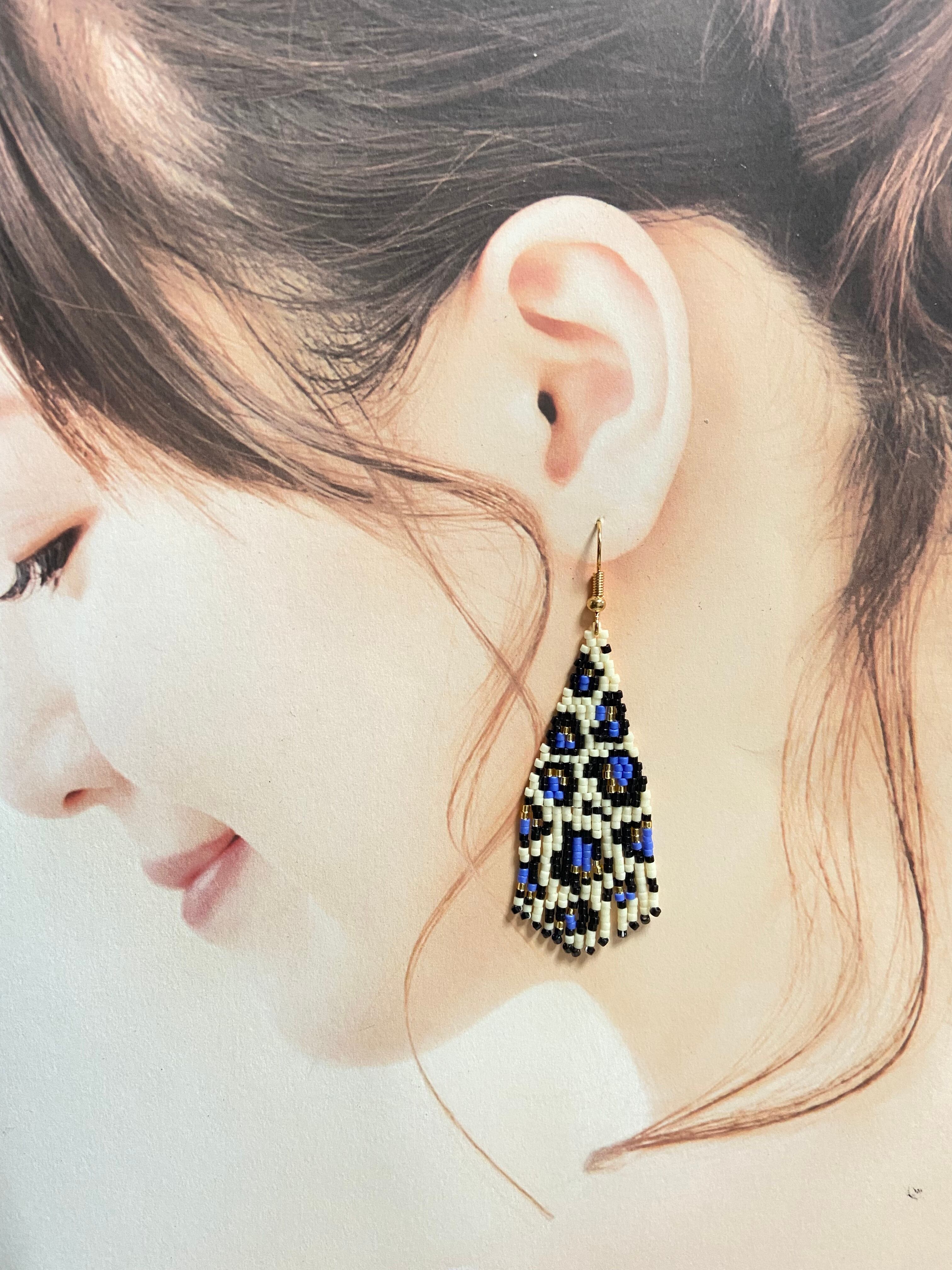 ヒョウ柄フリンジピアス E193 ビーズステッチ